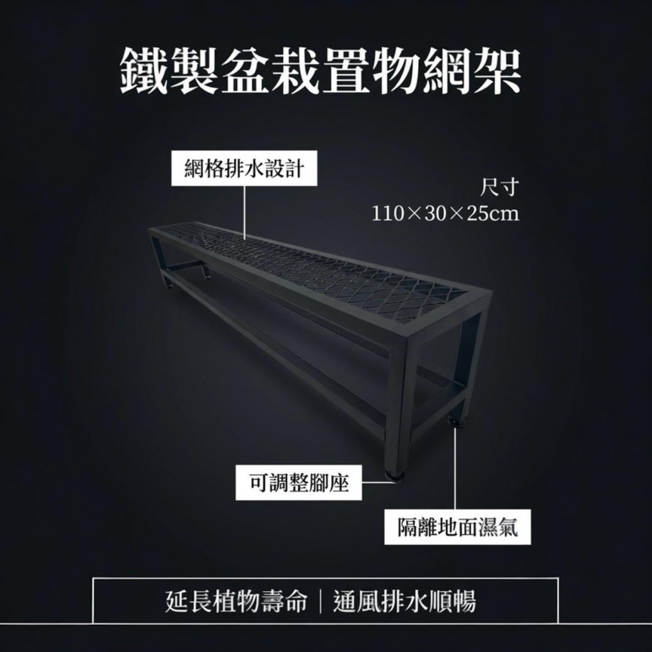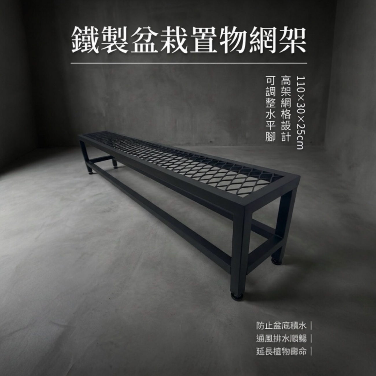 - 鐵製盆栽置物網架|可調整腳 水平微調 排水透氣 防爛根 110×30×25cm 鐵製盆栽置物網架|可調整腳 水平微調 排水透氣 防爛根 110×30×25cm 鐵製盆栽置物網架|可調整腳 水平微調 排水透氣 防爛根 110×30×25cm