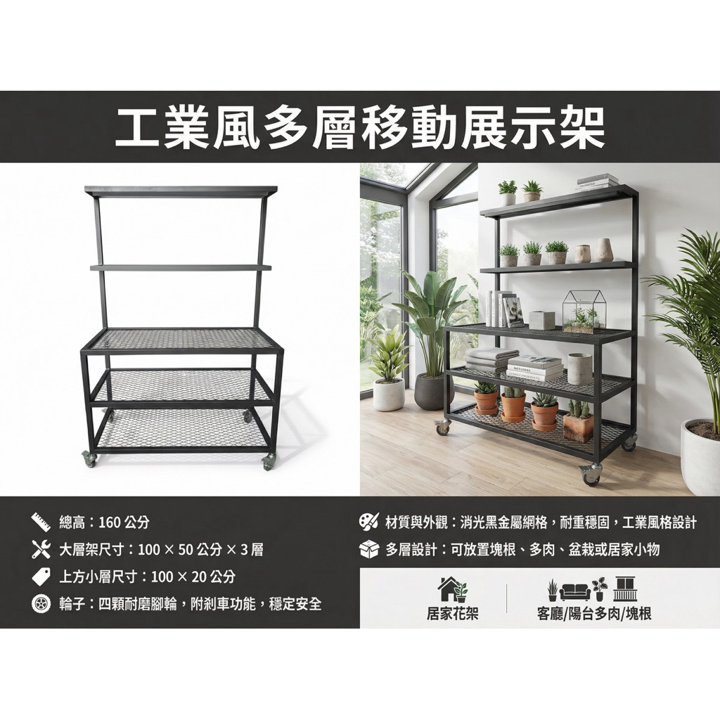 READ MORE消光黑金屬塊根植物架|可移動推車式 移動式金屬塊根植物架|附輪設計 黑鋼滾輪塊根植物架|多層可推設計 -